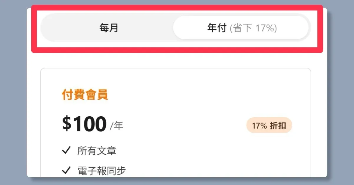 你可以自由選擇月付或年付,只要點擊附圖紅框中的按鈕即可自由切換。